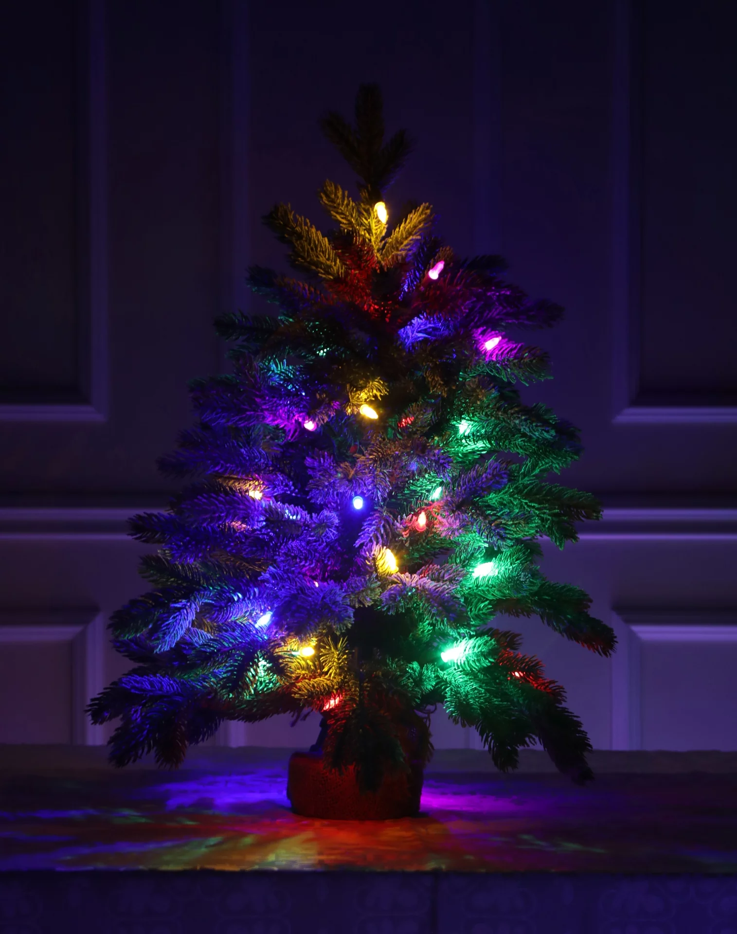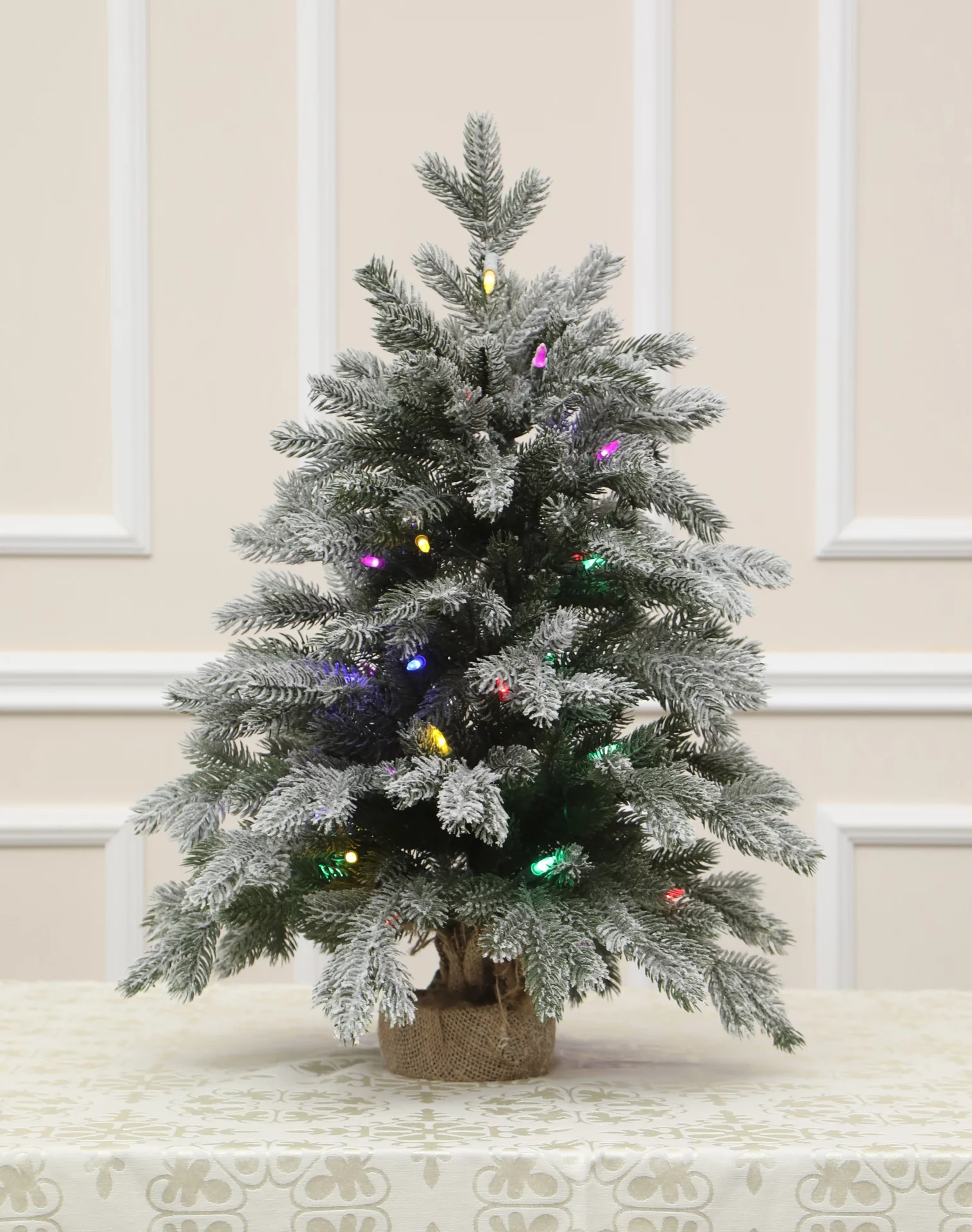 Ez a havas, színes fényű asztali műfenyő vidám és hangulatos kiegészítője lesz karácsonyi dekorációjának.