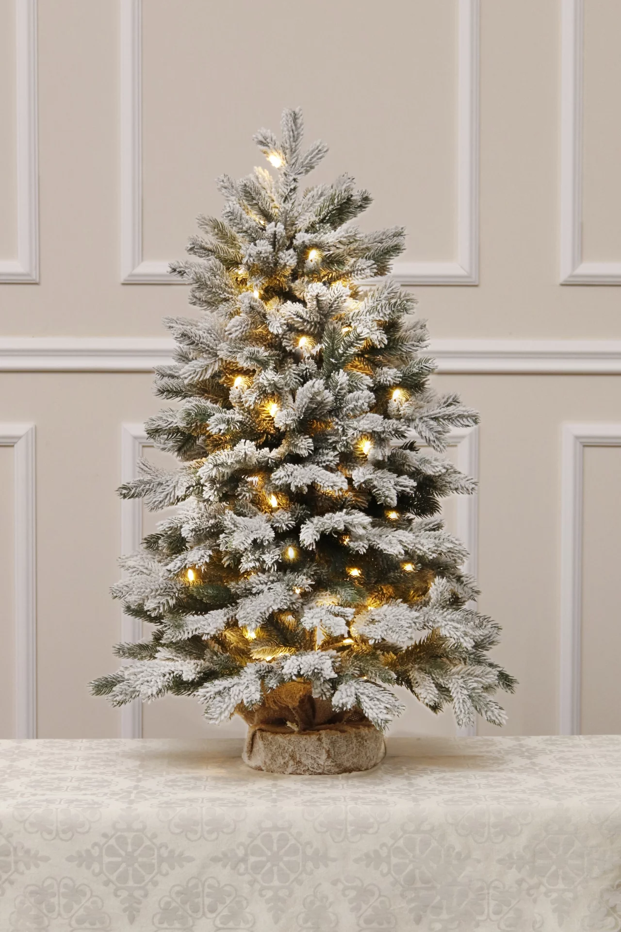 Asztali műfenyő 90 cm magas, havas kivitelben és LED– hangulatos fények téli megjelenéssel