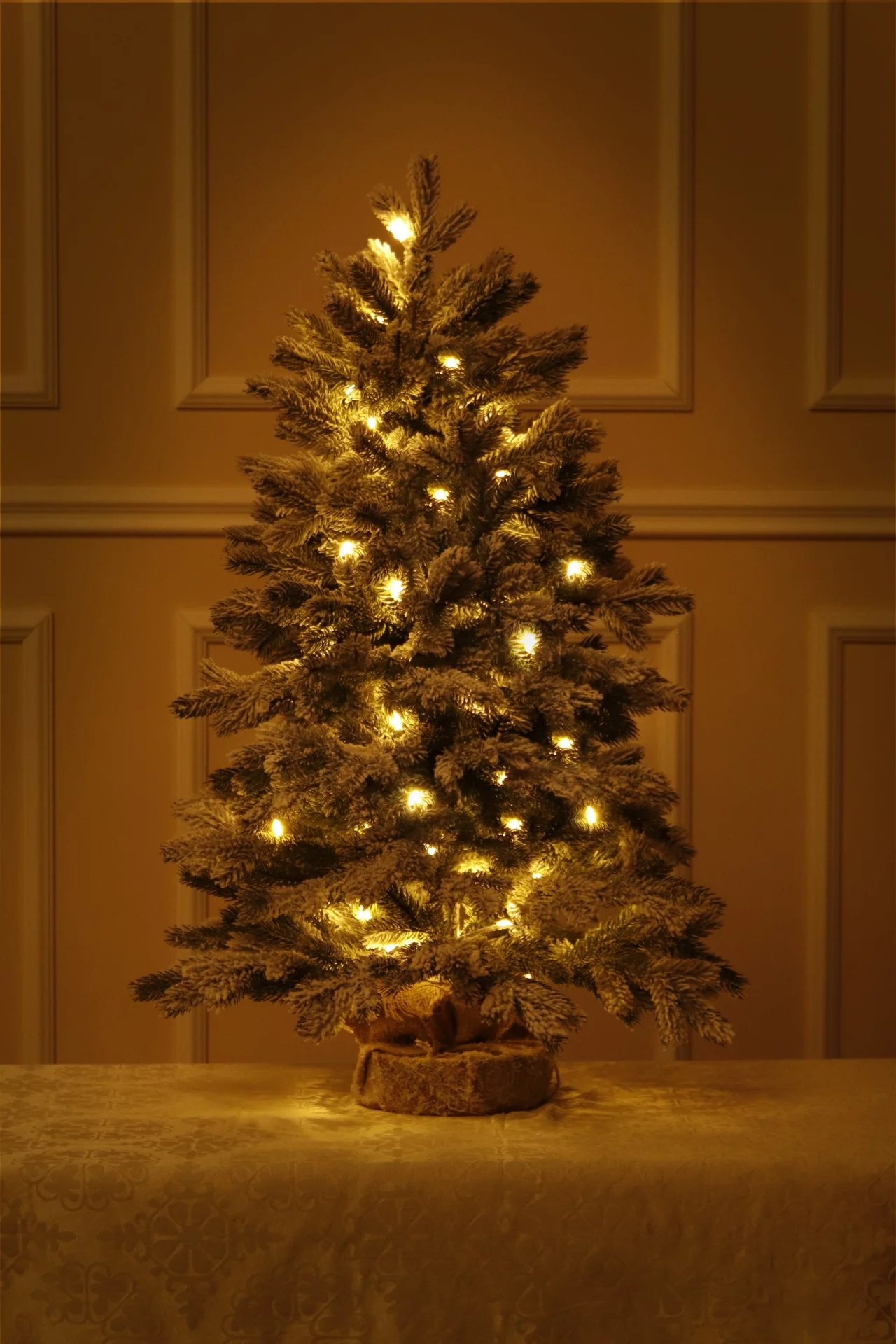 Ez a 90 cm magas, havas asztali műfenyő nemcsak téli hangulatával varázsol, hanem 50 darab meleg fehér LED fényével is, amely hálózatról működik. Kompakt mérete és dekoratív zsákvászon talpa miatt tökéletes választás asztalra, komódra, vagy akár a bejárat mellé.
